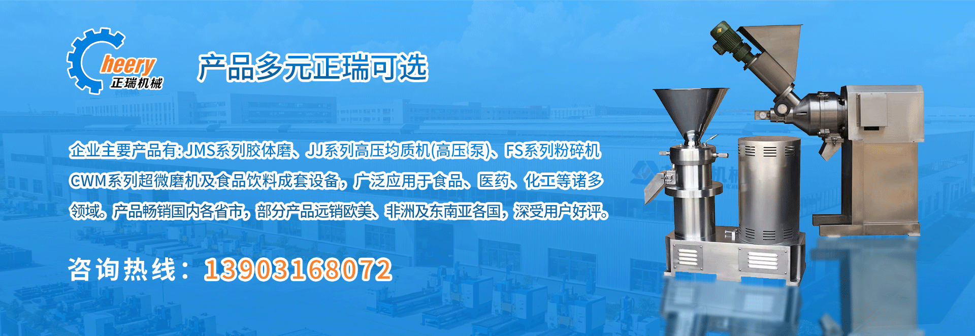主要產品:膠體磨系列、高壓均質機系列、粉碎機系列、超微磨機系列、食品飲料成套設備